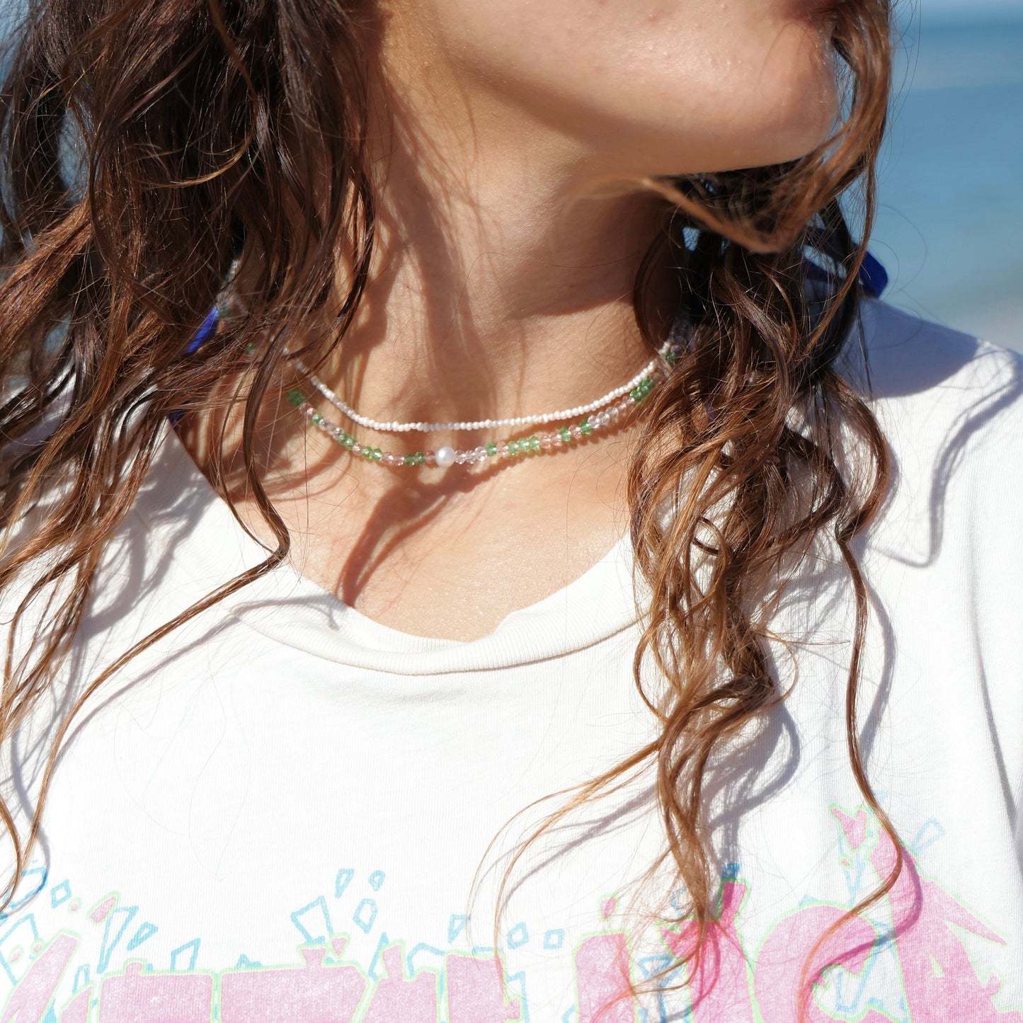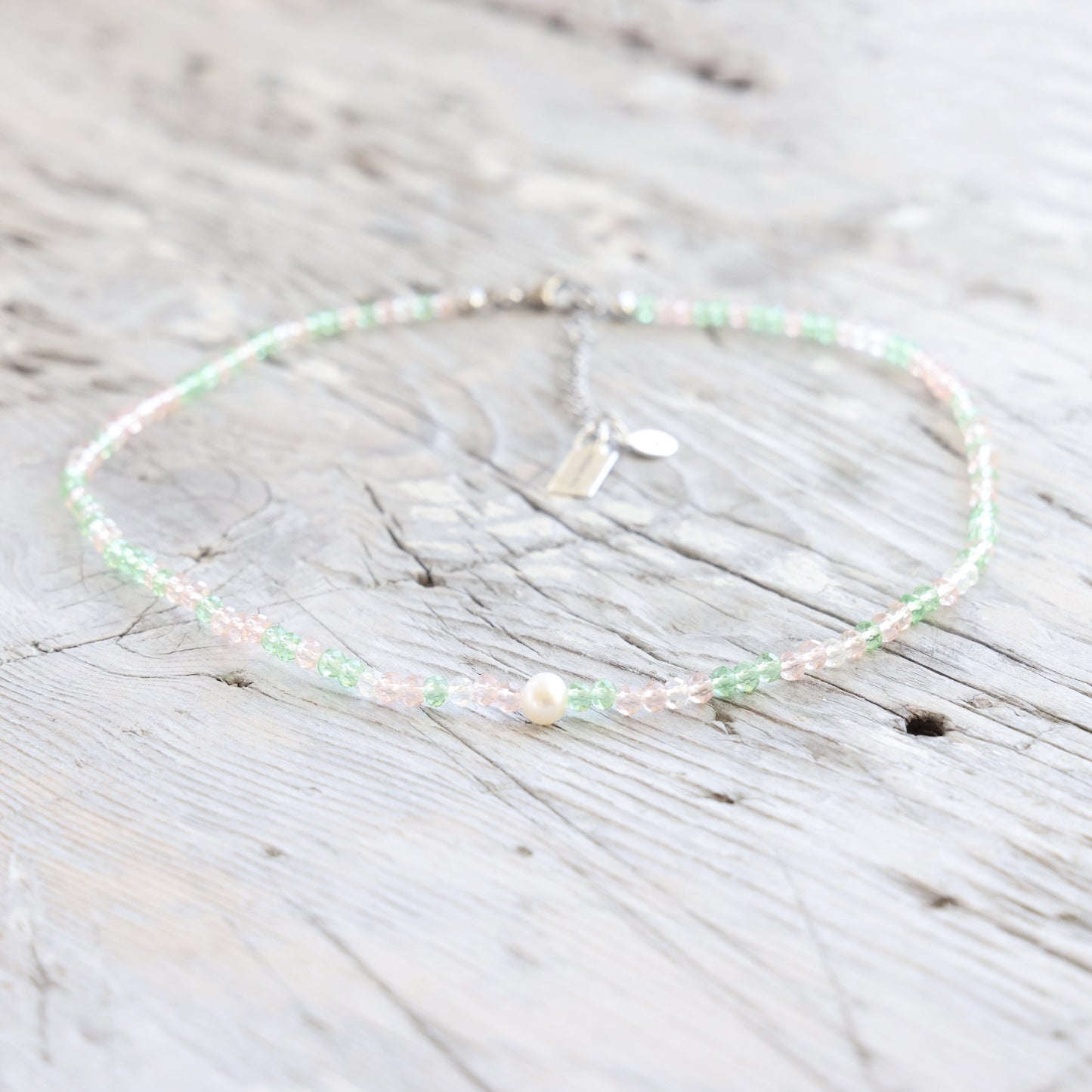 15” + 2” extender handmade pearl and glass choker. Each choker is adorned with a freshwater pearl, glass crystals, stainless steel clasp, and our signature Cape Cod charm.