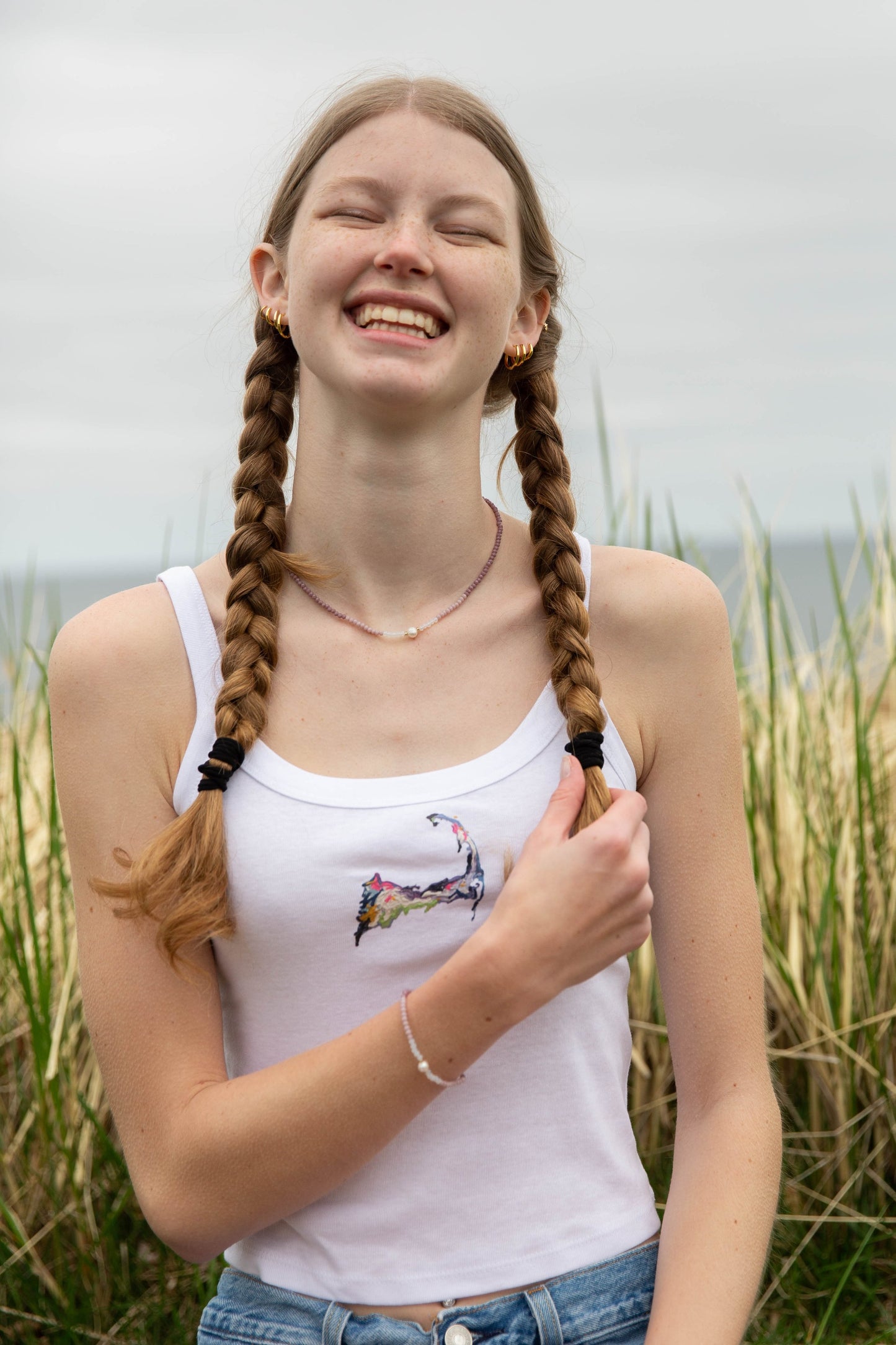 16” +extender choker. Each choker is adorned with a freshwater pearl, glass beads, and our Cape Cod charm with a stainless steel clasp.