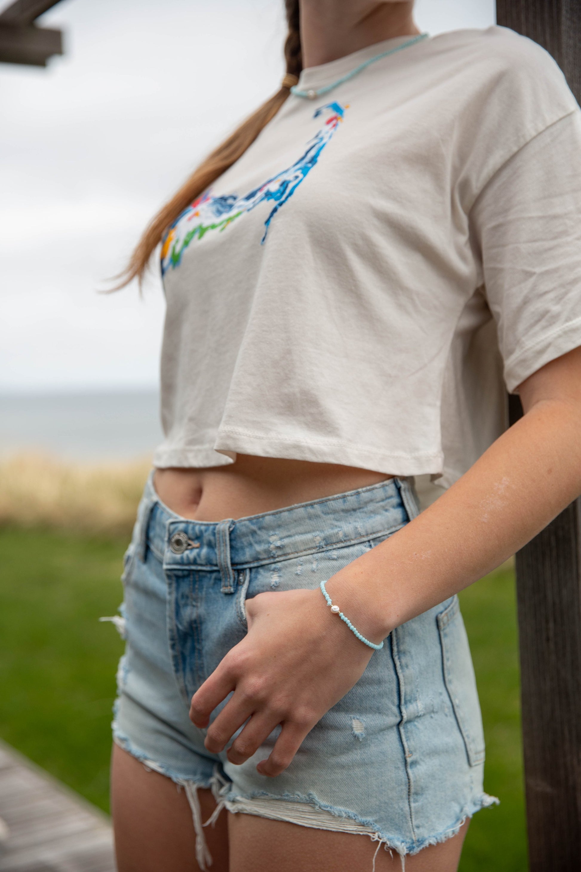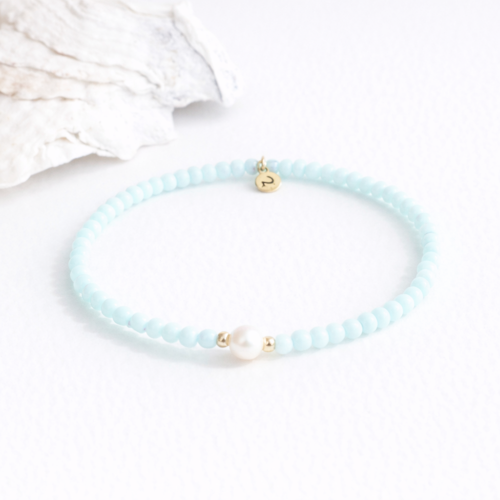 6.5-7” stretch pearl bracelet. Each bracelet is adorned with a freshwater pearl, glass beads, and our Cape Cod Choker charm.