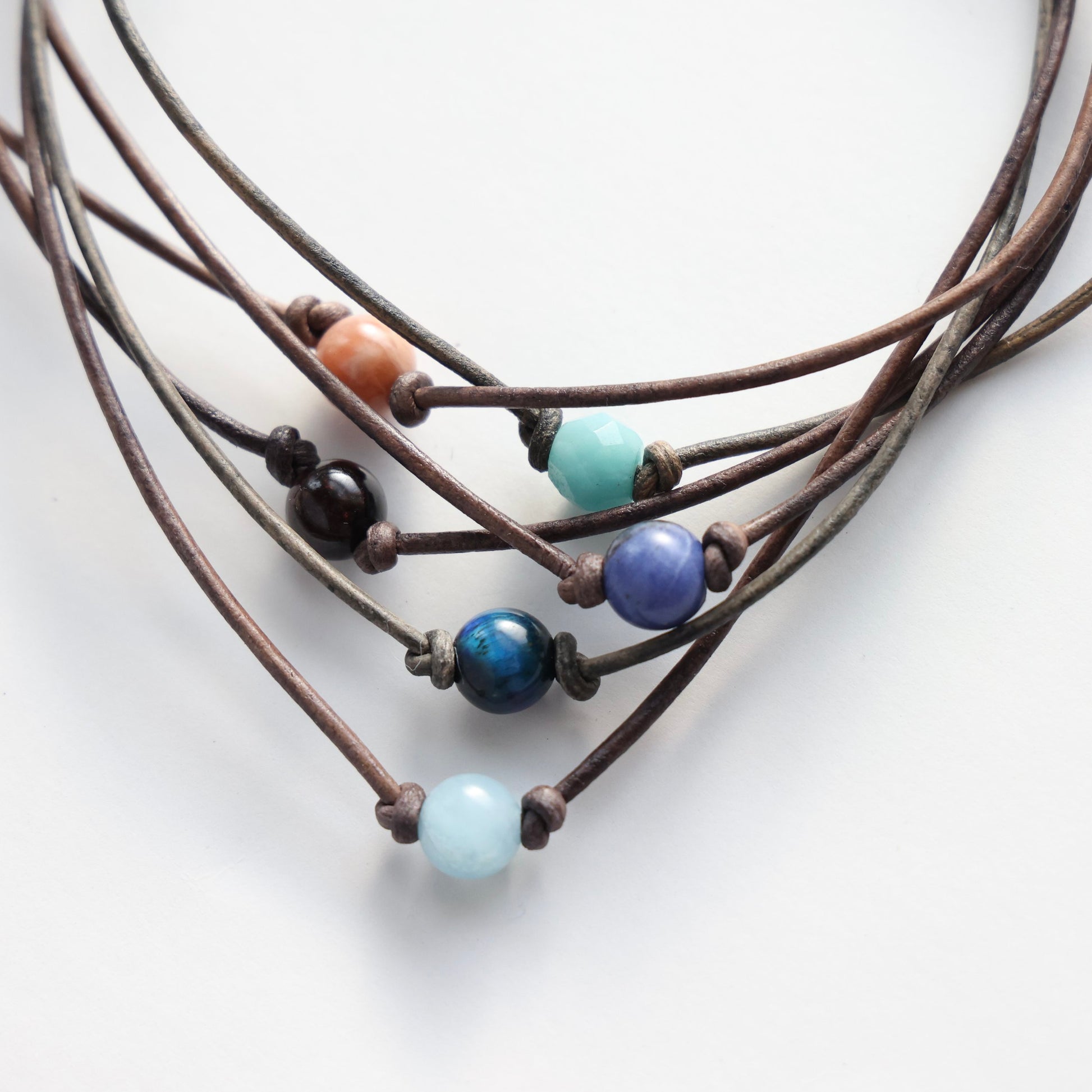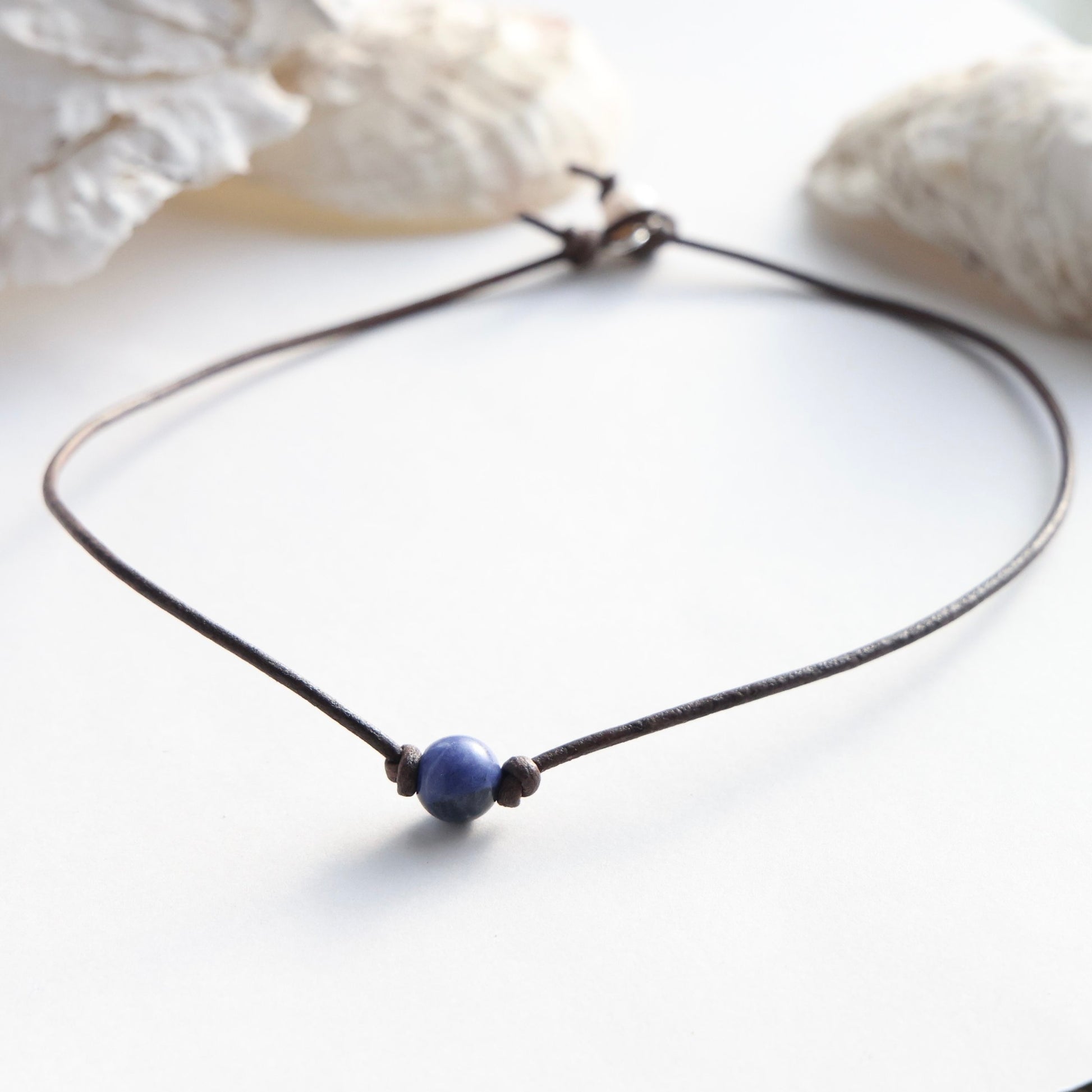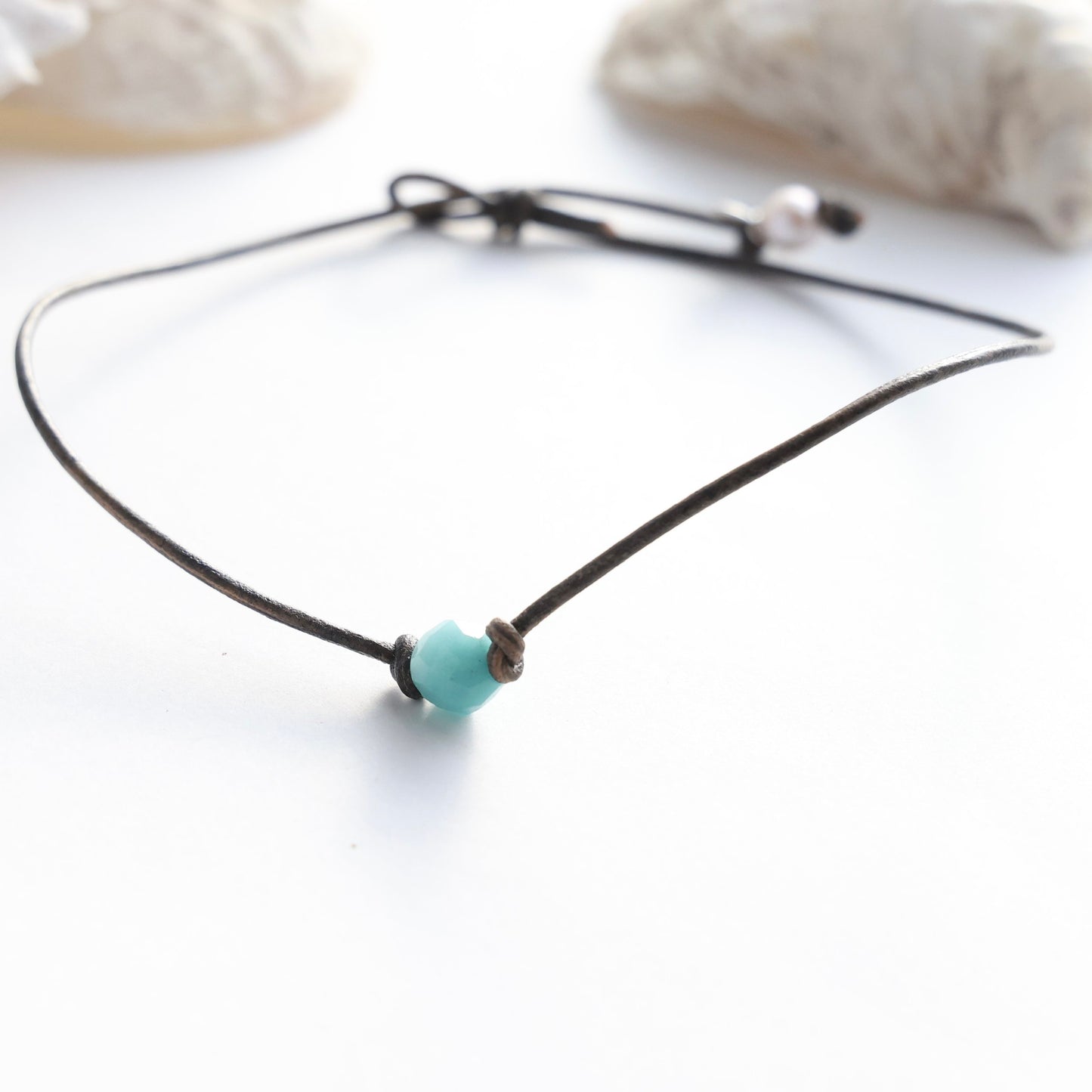 Each choker is adorned with a single gem stone, and our Cape Cod Choker charm delicately strung on leather lace. Each stone is beautifully unique with slight color & shape variations. Finished with our signature freshwater pearl.
