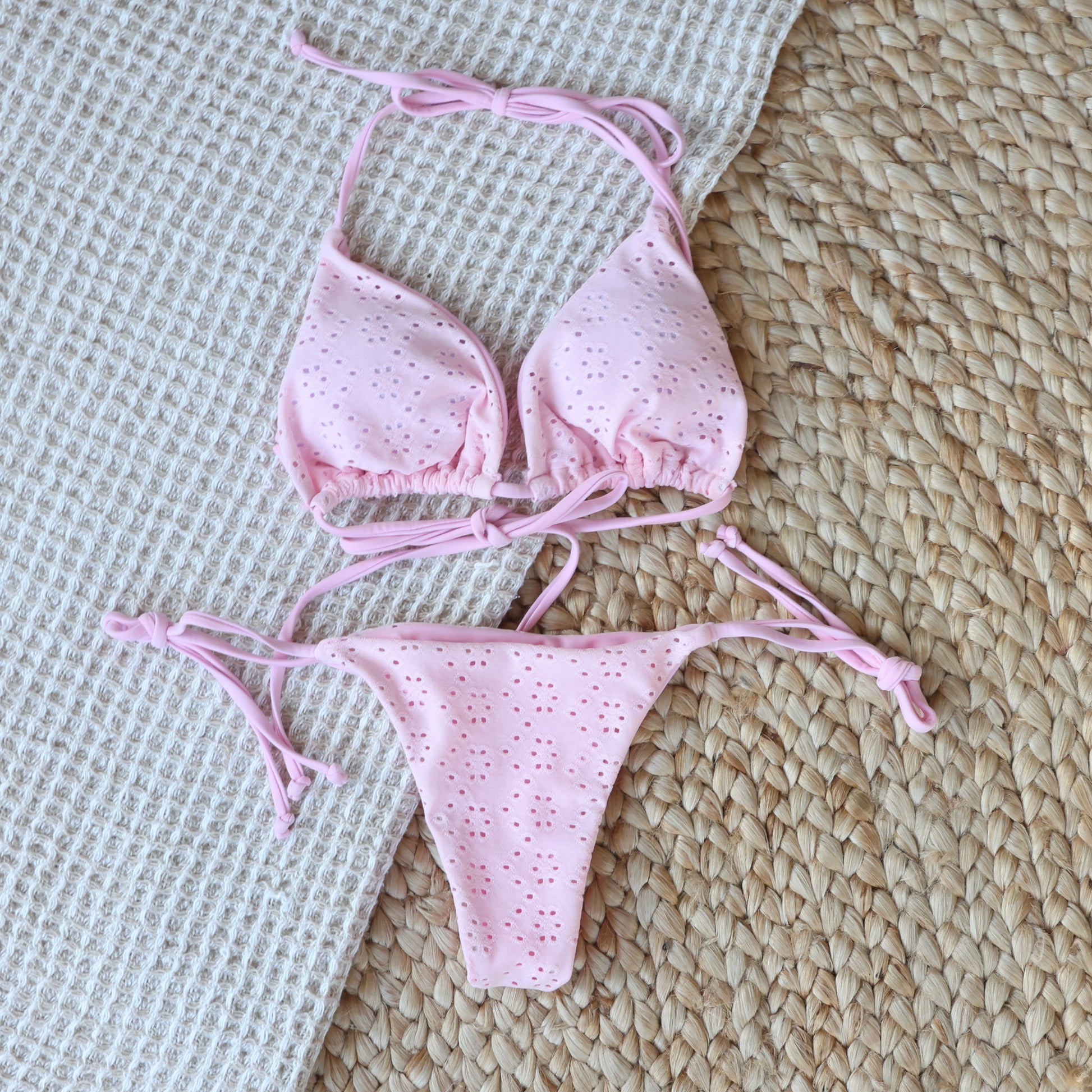 A sweet staple with a flirty twist — this soft pink bikini is crafted from eyelet fabric for a playful, vintage-inspired texture. Designed for beach girls who live for sun-drenched afternoons and soft coastal breezes.