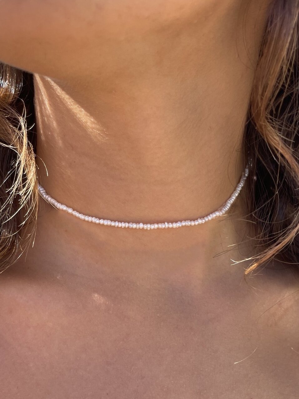 Dainty 14”+2 inch extender. Handmade affordable pearl choker. Hand-beaded with silk thread. Each choker is adorned with tiny freshwater seed pearls, Stainless Steel Lobster Clasp, and our Signature Cape Cod Charm .