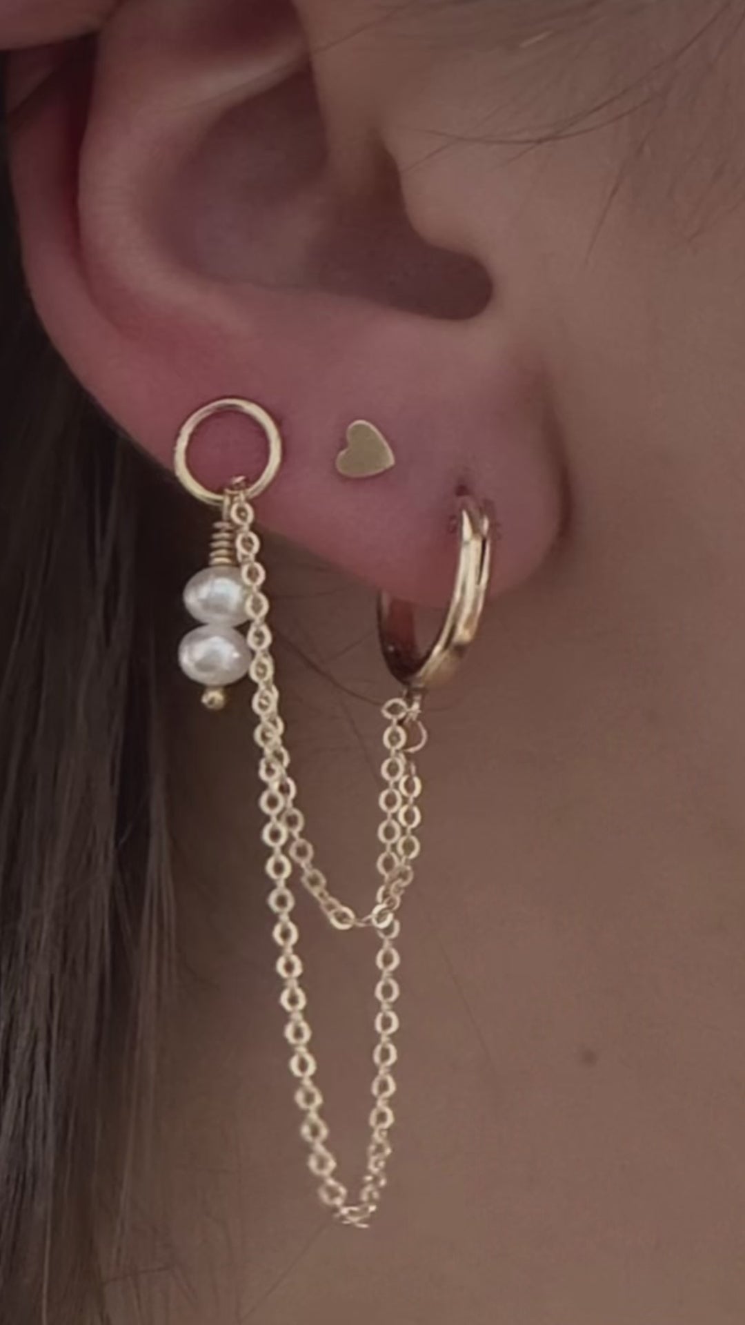 Image shown worn from the third piercing to the upper cartilage. Features a heart stud with a pearl drop, linked by a delicate chain to a circle stud.