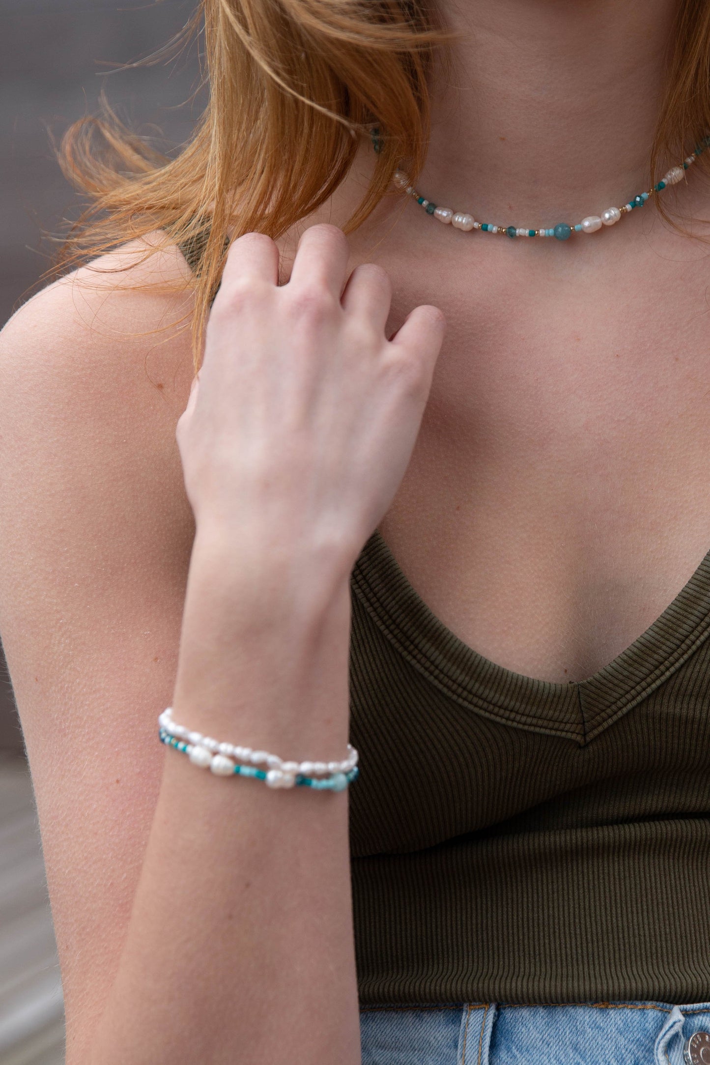 6 - 6.5 Stretch bracelet showcases an array of freshwater pearls, enveloped by mixed seed beads in calming hues of blue, green, and turquoise. The standout feature is the enchanting aquamarine, encapsulating the ocean’s serenity in a singular gem. Each bracelet is adorned with our distinctive Cape Cod charm.