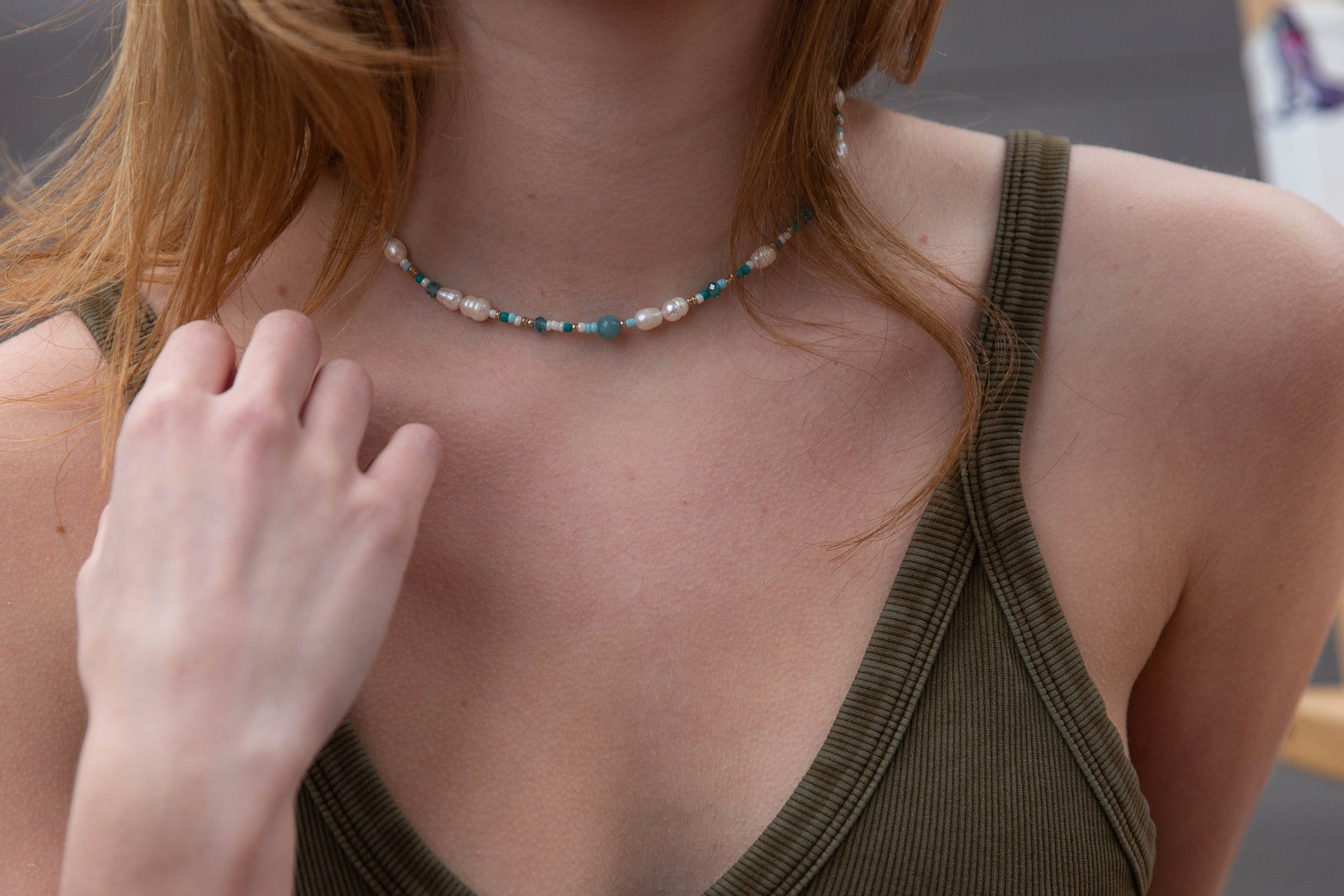 15"+2" extender This meticulously handcrafted Nauset Choker brings a vibrant splash of the sea right to your neckline. A true embodiment of coastal elegance, she sparkles all on her own or when layered with longer chain necklaces.