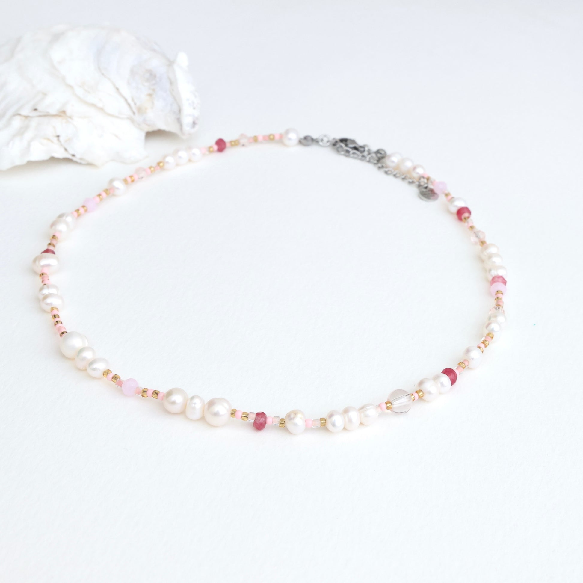 Freshwater pearls, mixed seed beads, and waterproof stainless steel lobster clasp. Finished with our signature Cape Cod charm.