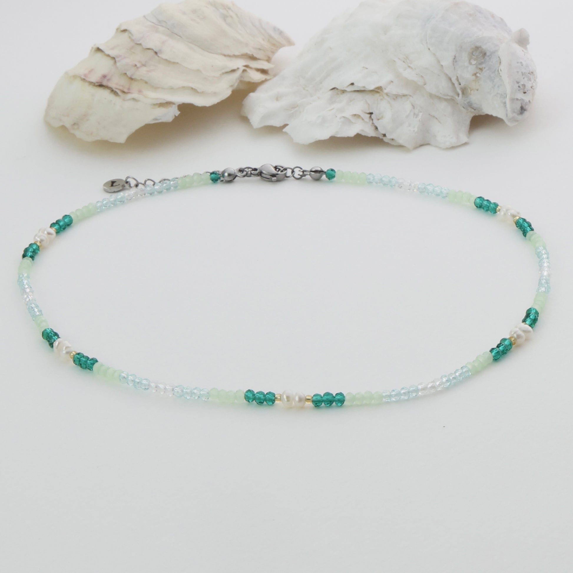 16” +extender choker. Each choker is adorned with a freshwater pearl, glass beads, and our Cape Cod charm with a stainless steel clasp.