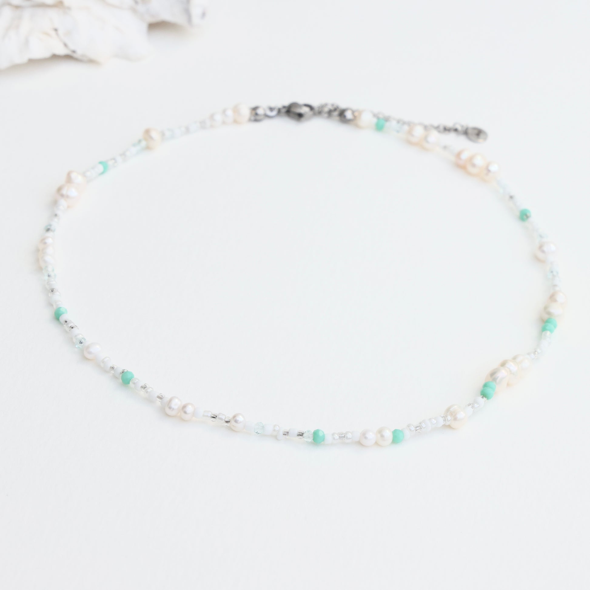 Freshwater pearls, mixed seed beads, and waterproof stainless steel lobster clasp. Finished with our signature Cape Cod charm.