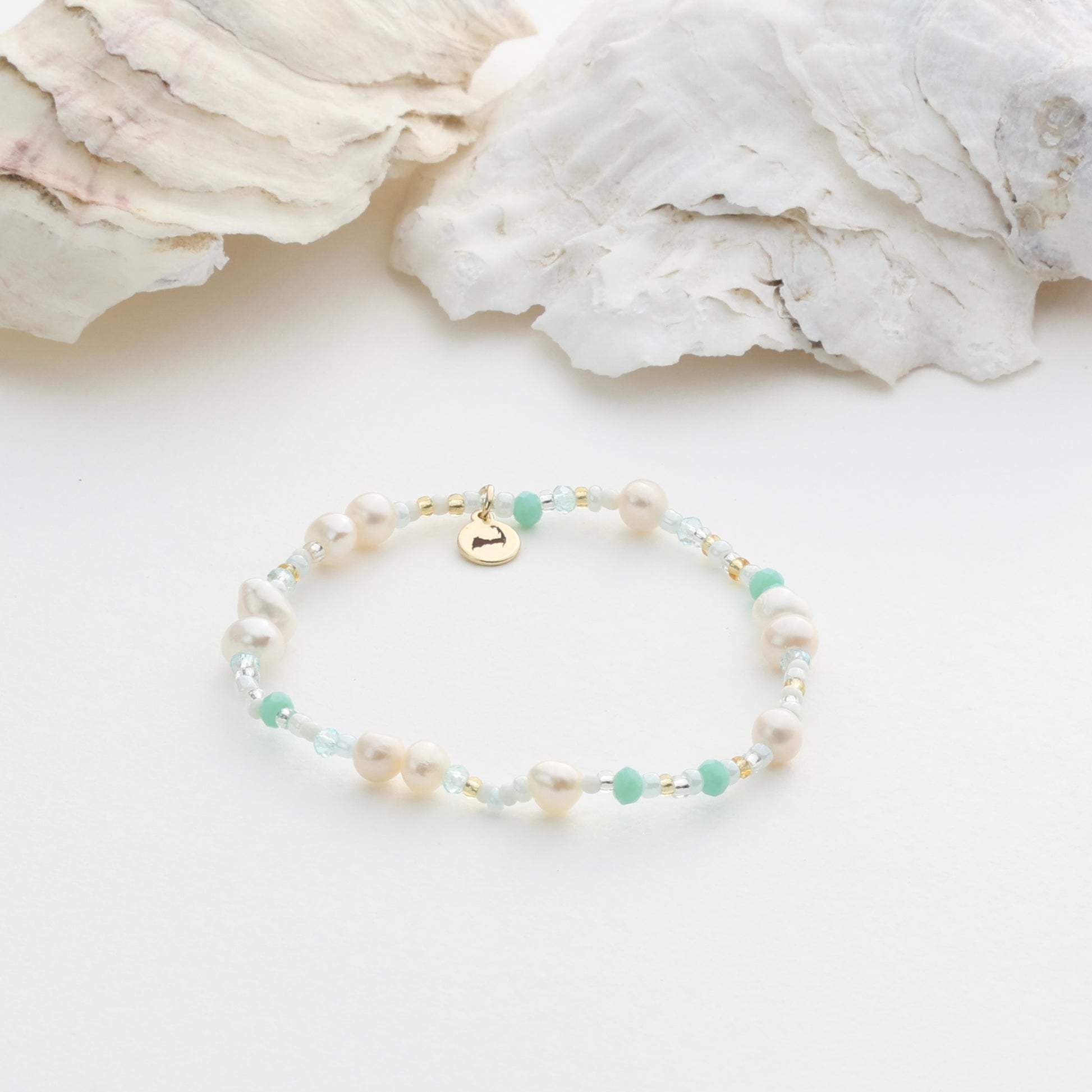 6-6.5β stretch bracelet. Freshwater pearls, mixed seed beads. Finished with our signature Cape Cod charm.