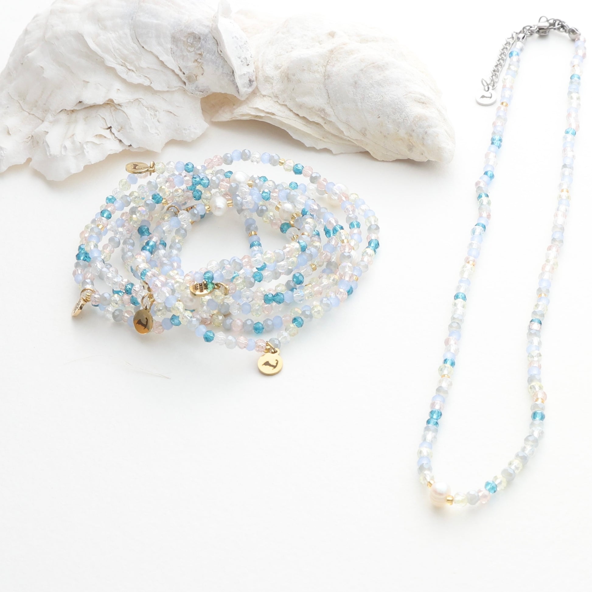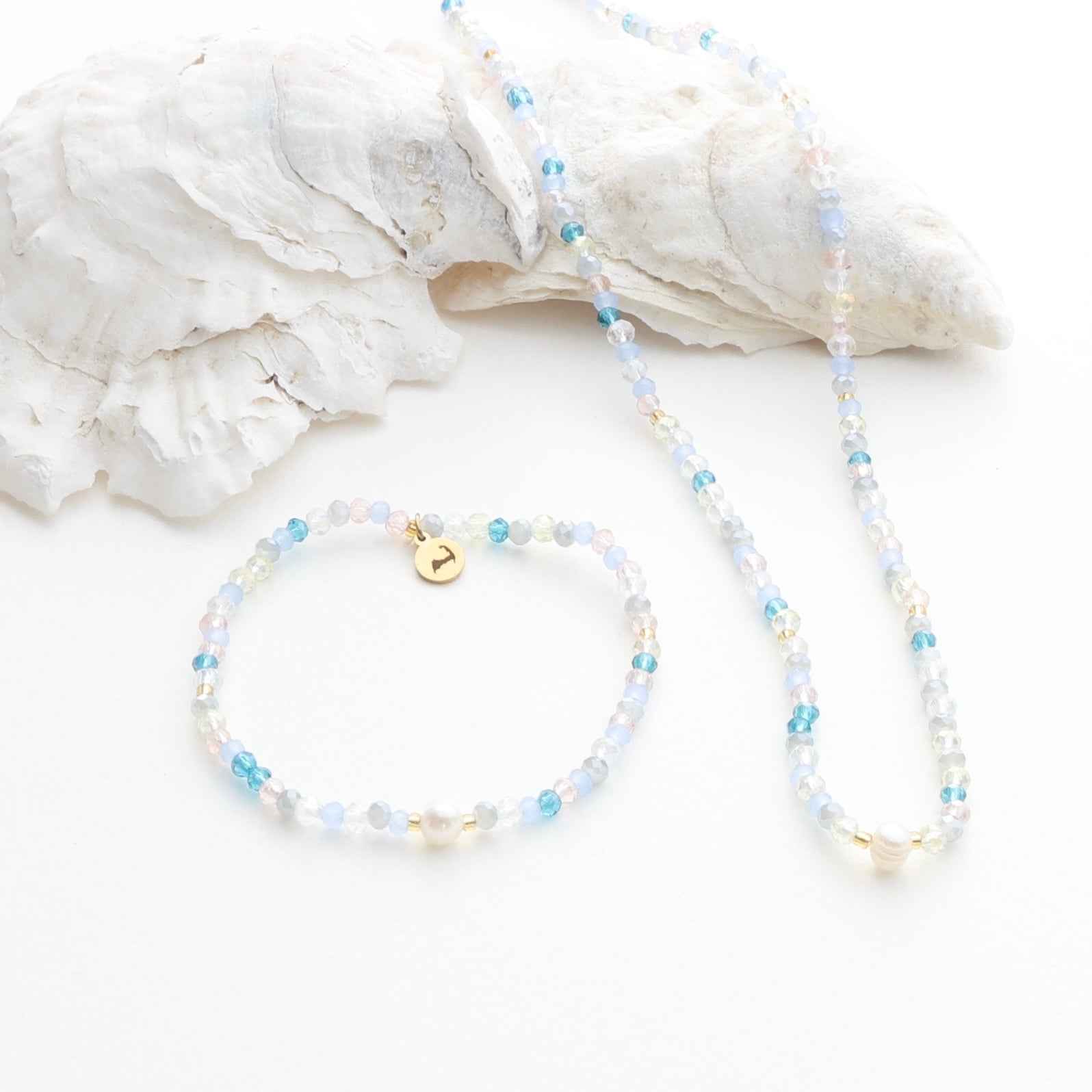 6.5-7” stretch pearl bracelet. Each bracelet is adorned with a freshwater pearl, glass beads, and our Cape Cod Choker charm.