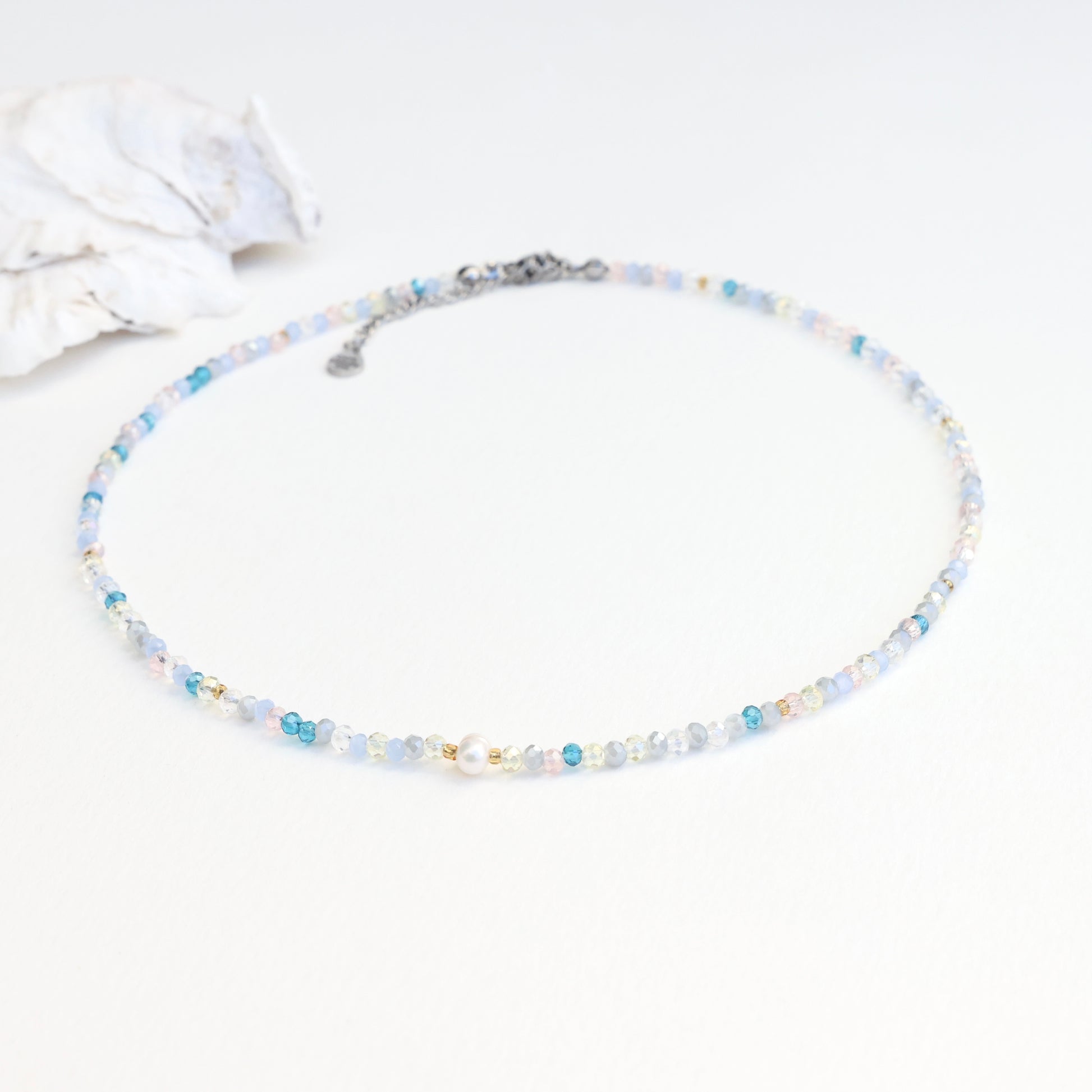 16” +extender choker. Each choker is adorned with a freshwater pearl, glass beads, and our Cape Cod charm with a stainless steel clasp.