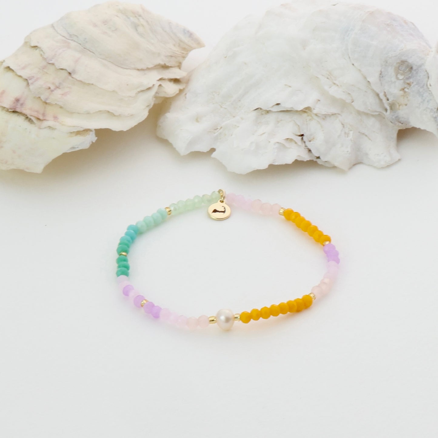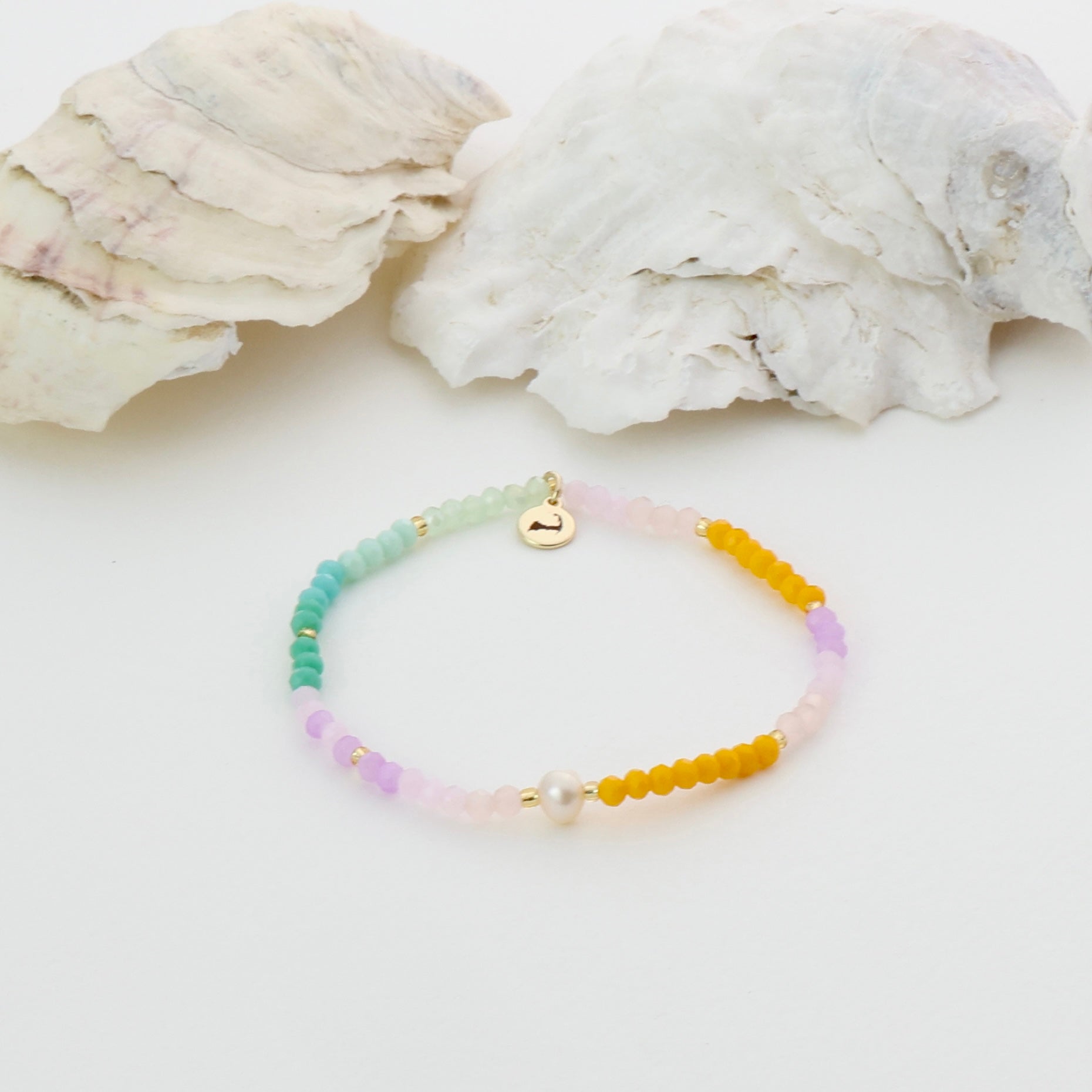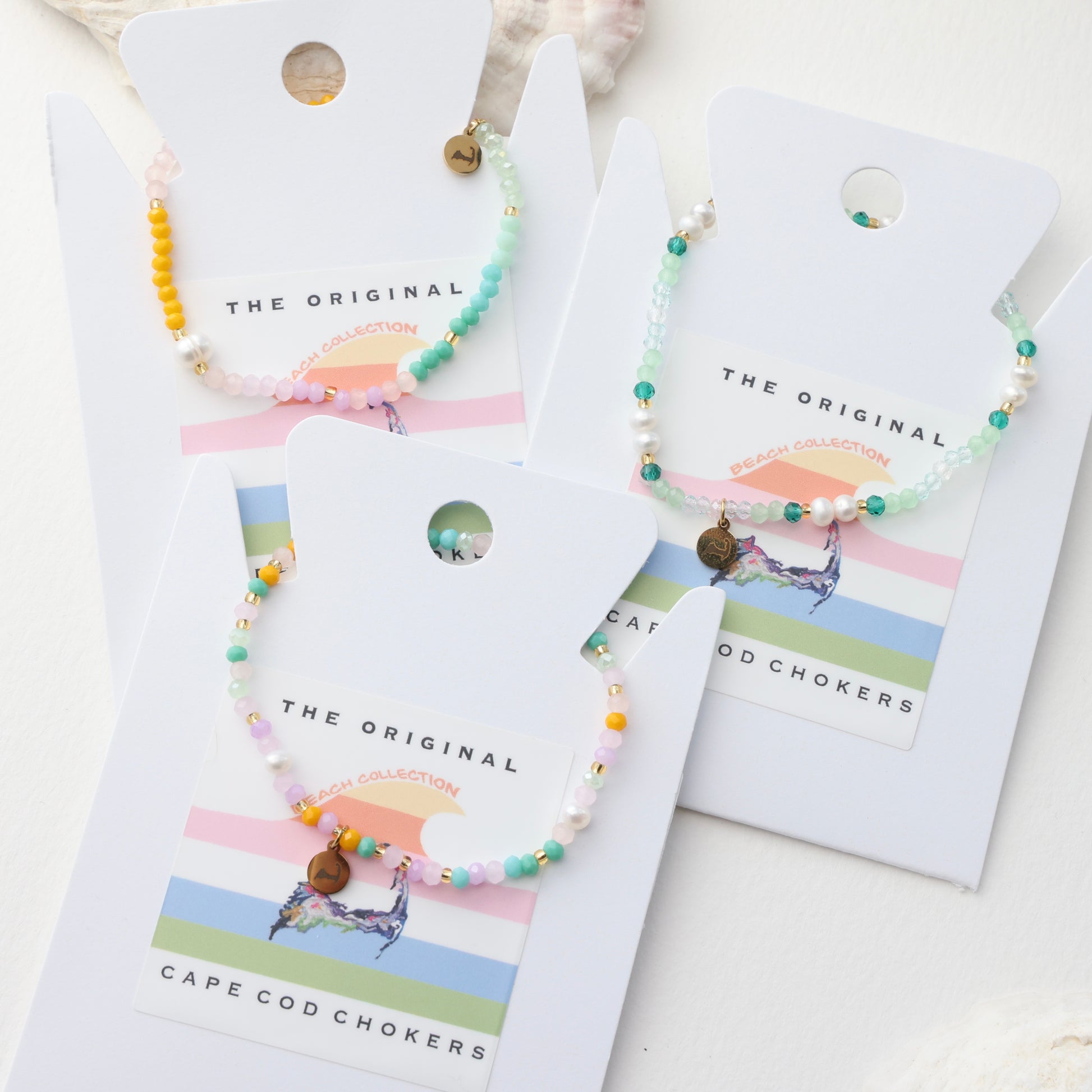 6.5-7” stretch pearl bracelet. Each bracelet is adorned with a freshwater pearl, glass beads, and our Cape Cod Choker charm.