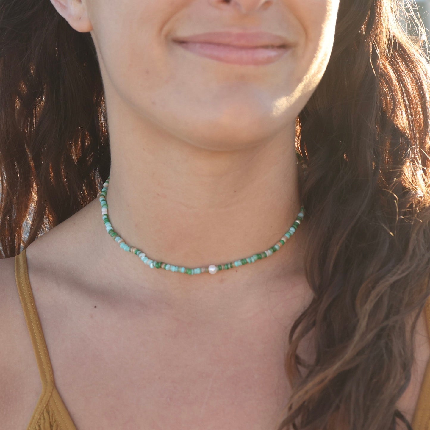 Dainty 14” + 2” extender handmade pearl and puka shell choker. Each choker is adorned with a tiny freshwater pearl, dyed natural puka shells, NEW stainless steel clasp, and our signature Cape Cod charm.