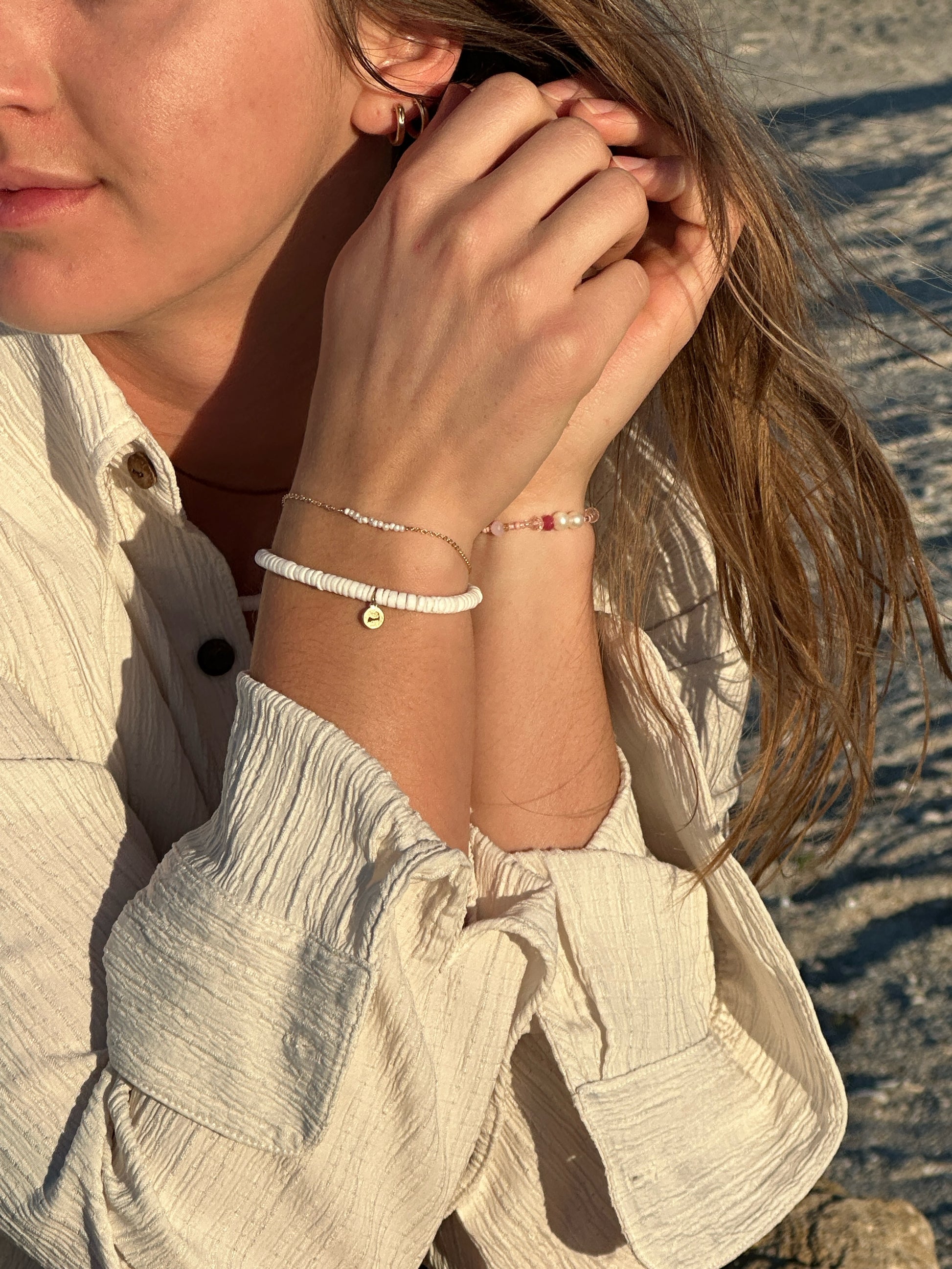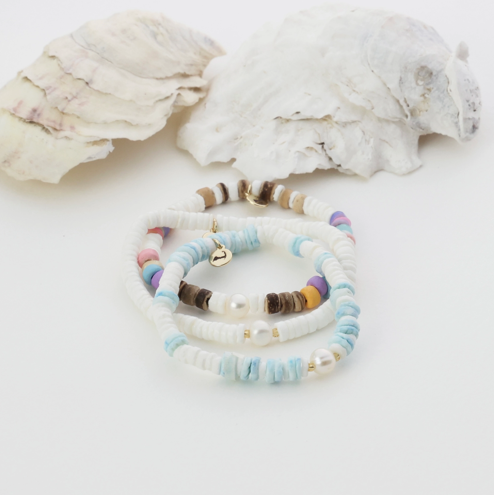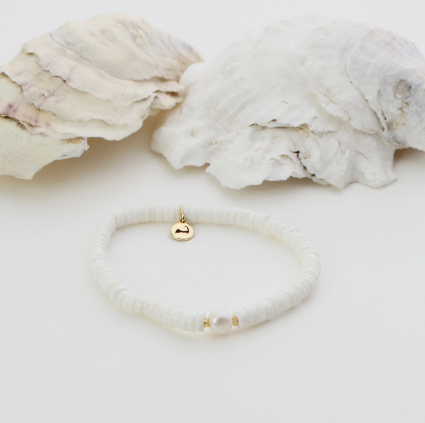 6.25-7” handmade stretch bracelet. Each bracelet is adorned with a tiny freshwater pearl, dyed natural puka shells, and our signature Cape Cod Chokers charm.
