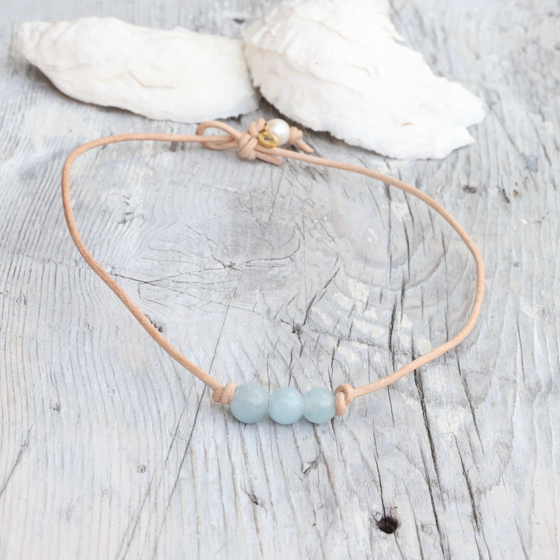 Each choker is adorned with 3 stones, and our Cape Cod Choker charm delicately strung on leather lace. Each stone is beautifully unique with slight color & shape variations. Finished with our signature freshwater Pearl.