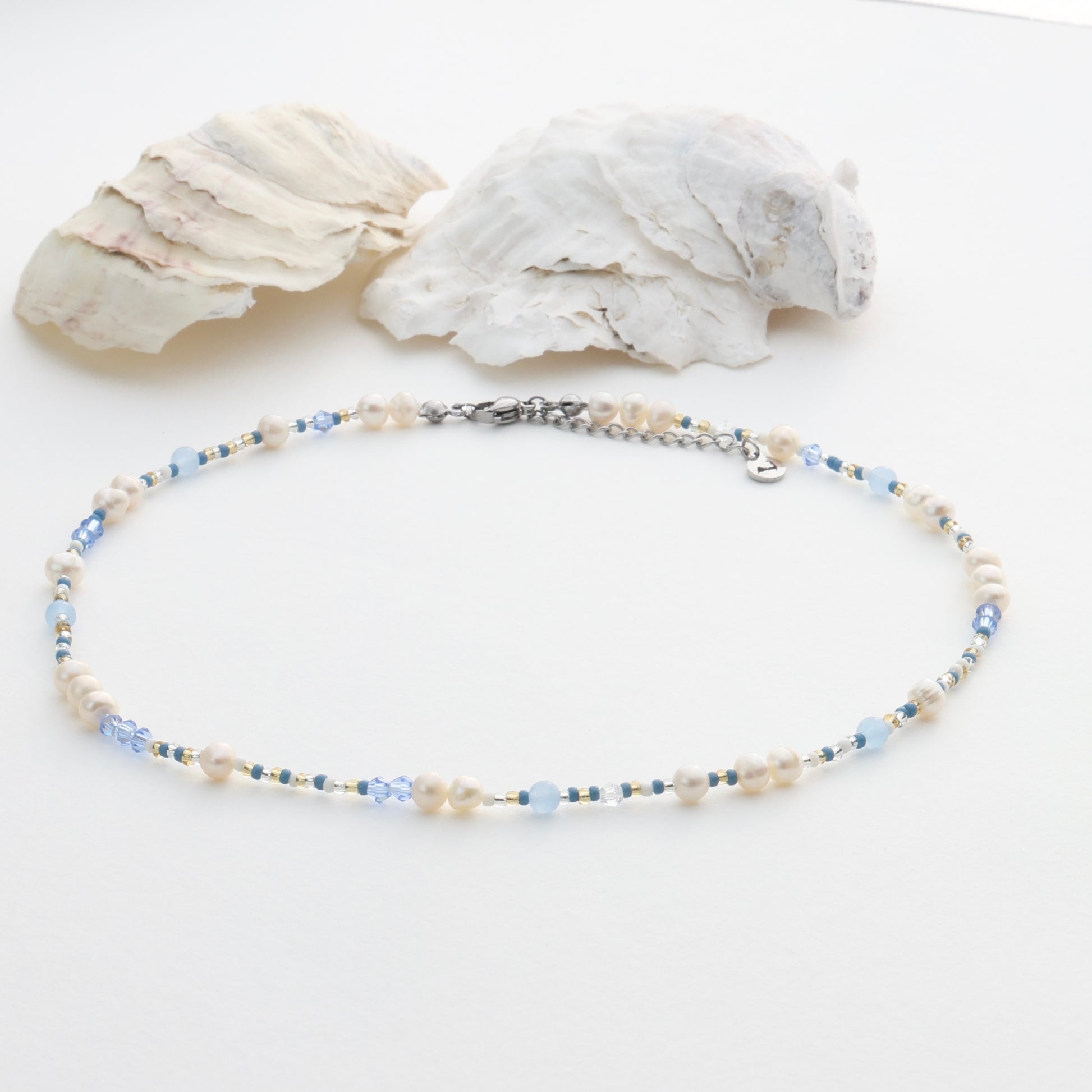 Freshwater pearls, mixed seed beads, and waterproof stainless steel lobster clasp. Finished with our signature Cape Cod charm.