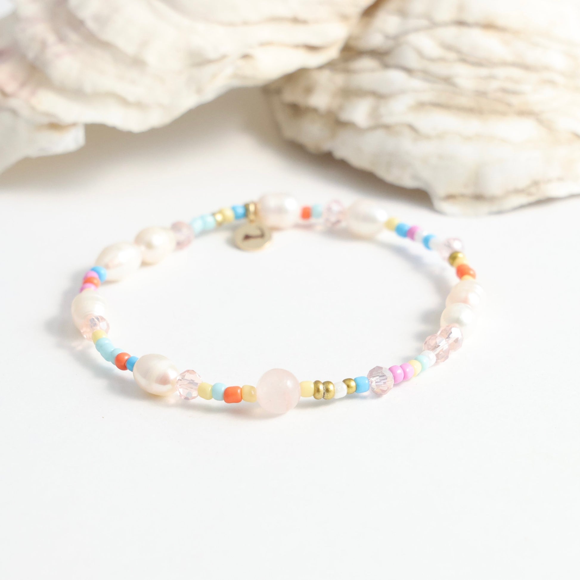 6-6.5β stretch bracelet. Freshwater pearls, mixed seed beads. Finished with our signature Gold Cape Cod charm.
